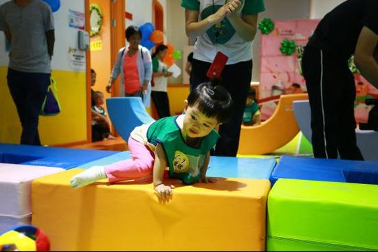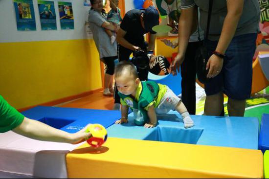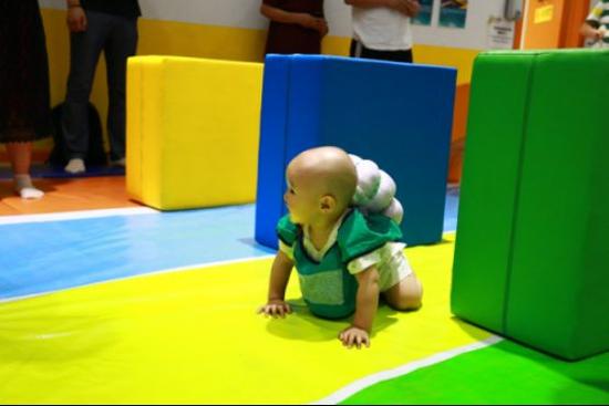 此外,14~18个月可独立行走的宝宝参加了“翻山越岭”障碍赛,宝宝们遇到障碍物或钻、或爬、或用翻滚的方式通过,各显神通。