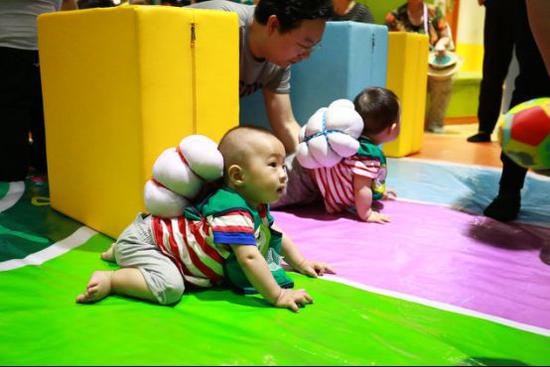 6月3日,儿童节的氛围还在延续,在亲亲袋鼠国际早教石景山中心,一场专属0~3岁宝宝的爬行比赛正在进行中,近70组家庭聚在一起,只见宝宝们有的身背“炸药包”匍匐前进,有的在加油声中加速爬行,有的在赛道上玩性大发,还有的边哭边爬……这就是亲亲袋鼠“妈妈奶瓶”杯爬行大赛现场热闹景象。